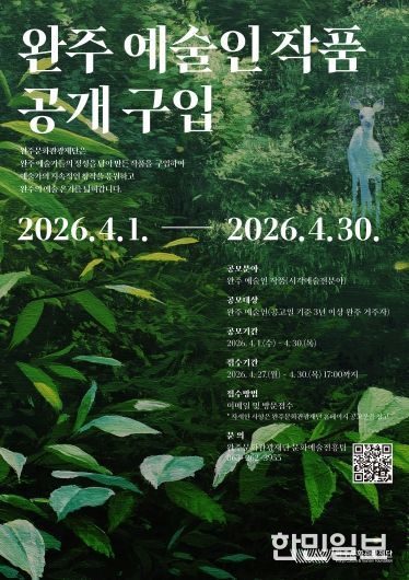 한민일보 서울포커스 박용남 기자 | (재)완주문화관광재단(이사장 유희태)은 지역 미술 시장 활성화와 예술인의 안정적인 창작 환경 조성을 위해 ‘2026 완주 예술인 작품 공개 구입’사업을 실시한다.