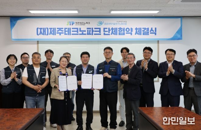 한민일보 서울포커스 임철현 기자 | 제주테크노파크(원장 지영흔,제주TP)와 공공과학기술연구노동조합 제주TP지부(위원장 최연택, 지부장 권철만)이 화합과 신뢰를 바탕으로 한 ‘단체협약’을 체결하며, 상생적 노사관계 정착과 지역 혁신성장의 동반자로서 공동 발전을 다짐했다.