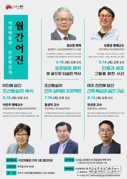 한민일보 서울포커스 김용택 기자 | 전주시 어진박물관은 4월부터 오는 8월까지 매월 셋째 주 목요일 인문학 강좌인 ‘월간어진’을 운영한다고 10일 밝혔다.