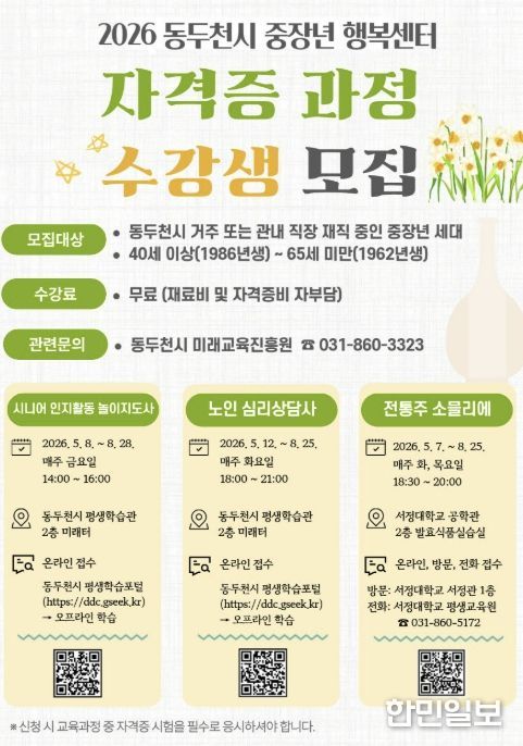 한민일보 서울포커스 임경복 기자 | 동두천시 미래교육진흥원은 지역 내 중장년층의 성공적인 인생 2막과 안정적인 사회 참여를 지원하기 위해 ‘2026년 중장년 행복센터 자격증 과정’ 수강생을 모집한다고 밝혔다.