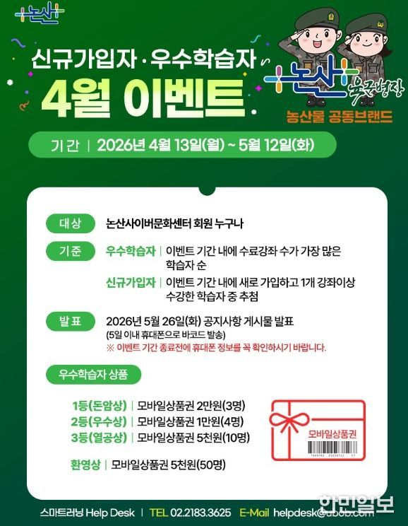 이번 이벤트는 4월 13일부터 5월 12일까지 진행되며, 논산시 사이버문화센터 회원이라면 누구나 참여할 수 있다.