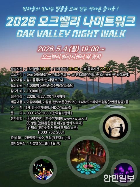 한민일보 서울포커스 임경복 기자 | 한국걷기협회와 아이파크리조트가 공동 주최하는 ‘2026 오크밸리 나이트 워크’가 다음 달 4일 원주에서 개최된다.