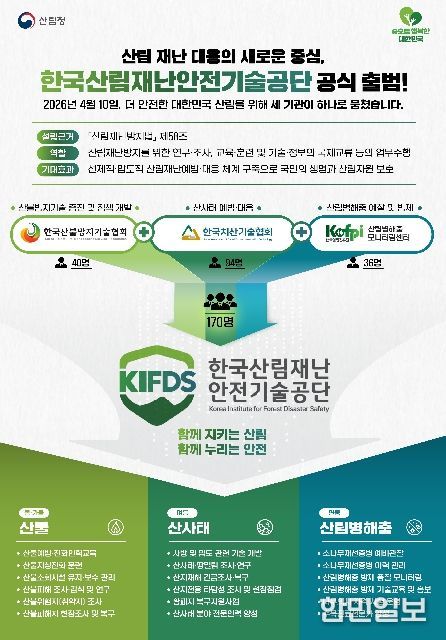 한민일보 서울포커스 최성훈 기자 | 산림청은 ‘한국산림재난안전기술공단(이사장 이임영)’이 지난 10일 공식 출범했다고 밝혔다. 이번 공단 출범은 ‘산림재난방지법’ 시행에 맞춰 산림이라는 동일 공간에서 연계 발생하는 다양한 재난에 보다 선제적이고 신속하게 대응하기 위한 기반을 마련했다는 점에서 의미가 있다.
