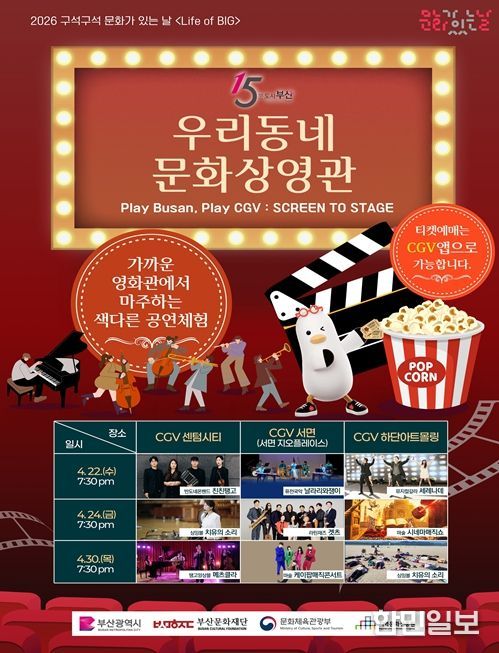 한민일보 서울포커스 임광현 기자 | 부산시는 문화체육관광부 공모사업 선정에 따른 '2026 '구석구석' 문화가 있는 날'의 일환으로, 씨지브이(CGV) 영화관과 협업해 시민들이 일상에서 문화를 더 가까이 즐길 수 있도록 '우리동네 문화상영관' 행사를 개최한다고 밝혔다.