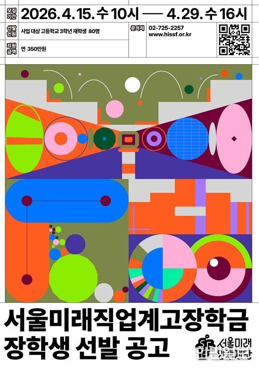 한민일보 서울포커스 국용호 기자 | 서울미래인재재단이 올해 서울 소재 고등학교 재학생 대상 장학금 3종의 장학생 1,250명을 동시 모집한다. 장학금 총 규모는 29억 원이며, 모집은 4월 15일 10시부터 29일 16시까지 진행된다. 신청은 각 학교를 통해 재단 누리집에서 온라인으로 진행된다.