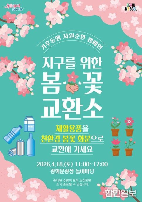 한민일보 서울포커스 국용호 기자 | 서울시는 제57회 지구의 날을 기념하여 ‘봄꽃 교환소’를 운영한다. 4월 18일 11시부터 광화문광장 놀이마당에서 열리는'2026 지구의 날'행사장에 일상 속 재활용 가능자원(재활용품)을 가져오면 봄꽃 화분과 교환할 수 있다.