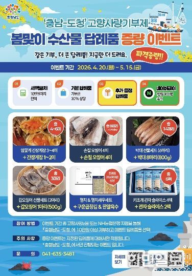 전병천 새마을공동체과장은 “봄철 충남의 신선한 수산물을 기부자들에게 알리고, 차별화된 혜택을 통해 고향사랑 실천의 즐거움을 더하고자 이번 행사를 기획했다”며 “많은 분들이 참여할 수 있도록 누리소통망(SNS), 포스터, 카드뉴스 등 다양한 매체를 통한 홍보에 최선을 다하겠다”고 말했다.
