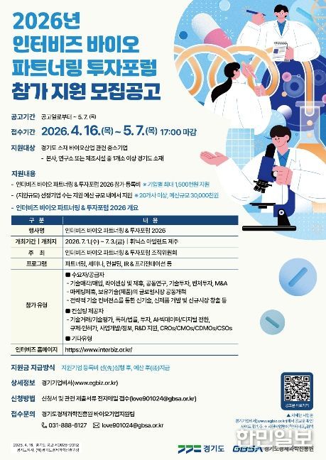 한민일보 서울포커스 김윤이 기자 | 경기도는 (재)경기도경제과학진흥원과 함께 도내 바이오·제약 기업의 기술사업화와 투자 활성화를 지원하기 위해 ‘인터비즈 바이오 파트너링&투자포럼 2026’에 참가할 기업을 모집한다.