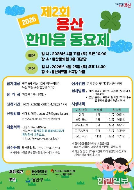 한민일보 서울포커스 김서윤 기자 | 서울 용산구가 4월 25일 토요일 오후 2시, 용산아트홀 소극장 가람(녹사평대로 150)에서 ‘제2회 용산 한마음 동요제’를 개최한다.