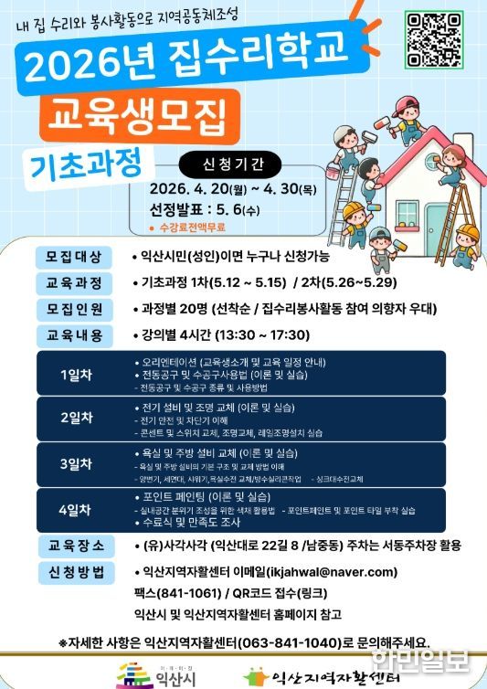 한민일보 서울포커스 김용택 기자 | 익산시는 오는 20일부터 30일까지 집수리학교 기초과정 교육생 40명을 모집한다.