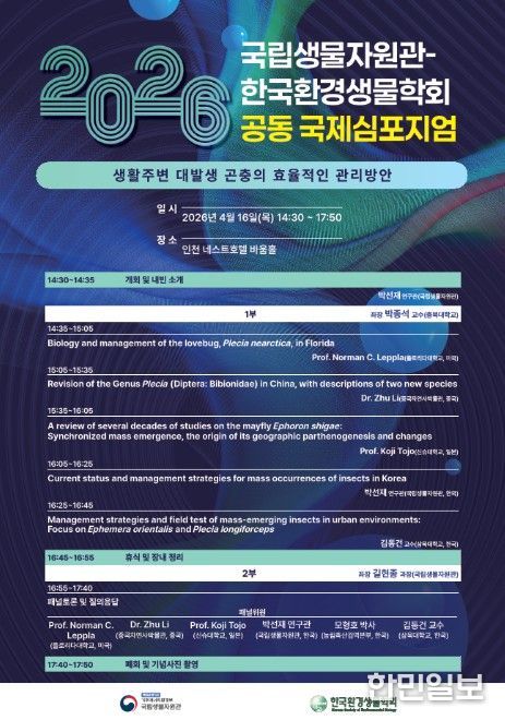 한민일보 서울포커스 진광성 기자 | 기후에너지환경부 소속 국립생물자원관은 환경생물학회와 공동으로 4월 16일 오후 네스트호텔(인천시 영종도 소재)에서 ‘생활주변 대발생 곤충의 효율적인 관리방안’이라는 주제로 국제학술토론회(심포지엄)를 개최한다고 밝혔다.
