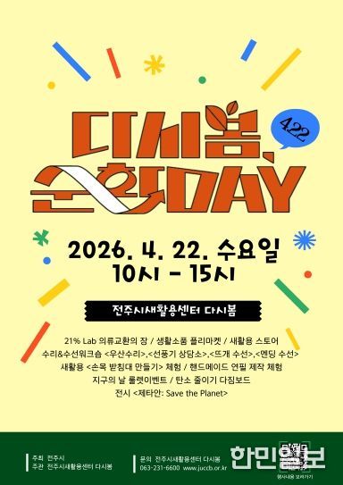 한민일보 서울포커스 김용택 기자 | 전주시새활용센터 ‘다시봄’은 오는 22일 ‘지구의 날’을 맞아 의류 폐기물을 줄이고 자원 순환의 가치를 공유하는 ‘다시봄 순환 Day 4.22’ 행사를 개최한다.