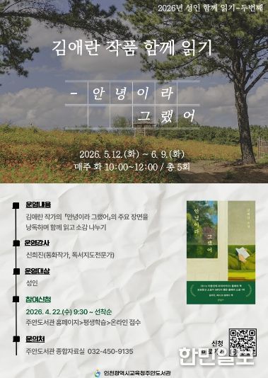 한민일보 서울포커스 유창렬 기자 | 인천광역시교육청주안도서관은 오는 22일부터, 성인 함께 읽기 독서동아리 ‘김애란 작품 함께 읽기’ 참여자를 모집한다.