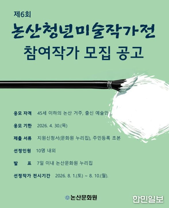 한민일보 서울포커스 유돈상 기자 | 논산문화원은 논산 지역 청년 미술가들의 창작 의욕을 고취하고 지역 미술 발전을 도모하기 위해 ‘제6회 논산청년미술작가전’ 참여 작가를 모집한다고 밝혔다.