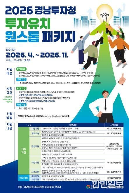 한민일보 서울포커스 임철현 기자 | 경남투자경제진흥원 경남투자청은 도내 투자기업의 안정적인 정착과 성장을 지원하기 위해 ‘2026년 투자유치 원스톱 패키지 서비스’를 추진한다고 밝혔다.