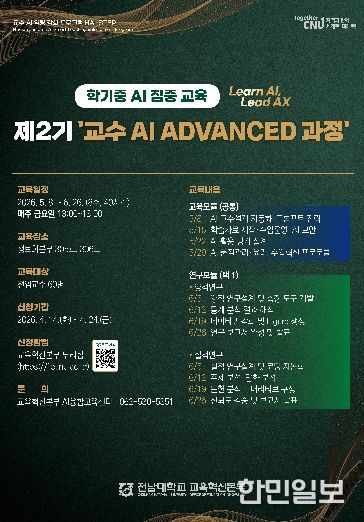 한민일보 서울포커스 박정민 기자 | 전남대학교 교육혁신본부는 전임교원의 AI 활용 교수설계 및 연구 역량 강화를 위한 ‘제2기 교수 AI ADVANCED 과정’을 학기 중 운영한다.