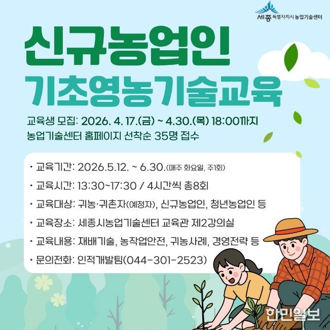 한민일보 서울포커스 김윤이 기자 | 세종특별자치시 농업기술센터가 귀농·귀촌자 및 신규농업인을 대상으로 신규농업인 기초영농기술교육 1기 교육생을 선착순 모집한다고 17일 밝혔다.