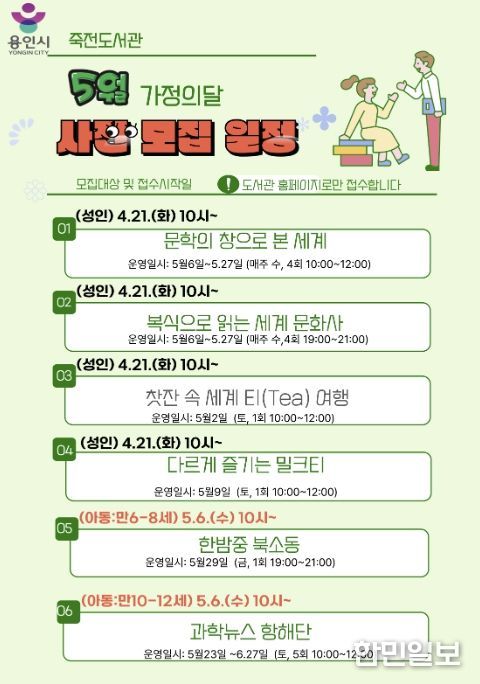 한민일보 서울포커스 김성윤 기자 | 용인특례시 죽전도서관은 오는 5월 가정의 달을 맞아 ‘2026년 5월 독서문화행사’를 개최한다.