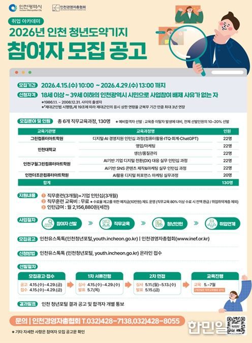 한민일보 서울포커스 유창렬 기자 | 인천광역시는 청년의 취업역량을 강화하고 지역기업이 필요로 하는 실무형 인재를 양성하기 위해 ‘2026 인천 청년도약기지’ 사업 참여자 130명을 4월 15일부터 4월 29일까지 모집한다고 밝혔다.