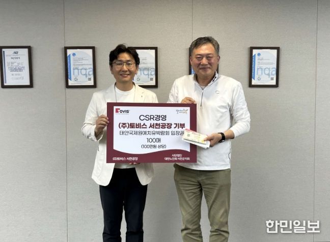 한민일보 서울포커스 임경복 기자 | 서천군 장항국가생태산단 입주기업인 ㈜토비스(대표이사 하희조·김용범)가 지난 16일 지역 어르신들을 위해 ‘2026 태안 국제 원예치유 박람회’ 입장권 100매를 대한노인회 서천군지회(지회장 김윤태)에 기탁했다.