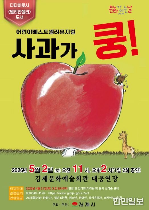 한민일보 서울포커스 박용남 기자 | 동화 속 세상이 무대위로 뿅~ 베스트셀러이자 스테디셀러인 동화를 각색해 만든 어린이 뮤지컬 <사과가 쿵!~>이 오는 5월 2일 오전 11시, 오후 2시 김제문화예술회관 대공연장에서 펼쳐진다.