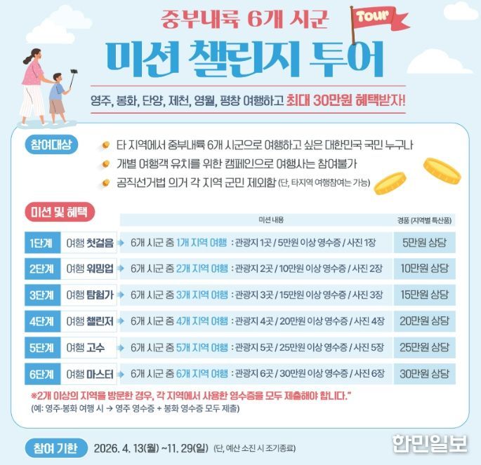 한민일보 서울포커스 김봉순 기자 | 경북 영주시는 중부내륙 6개 시군(영주, 봉화, 단양, 제천, 영월, 평창)의 관광 활성화를 위해 ‘미션 챌린지 투어’를 운영하고 있다고 17일 밝혔다.