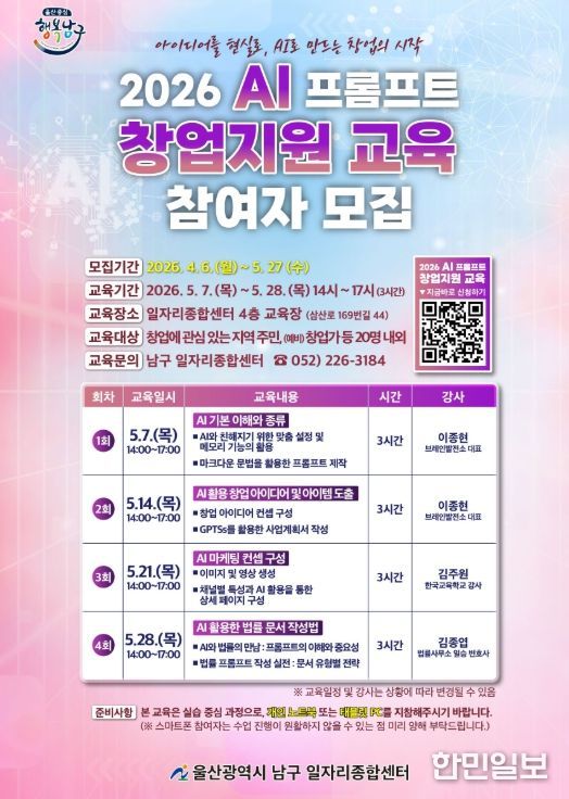 한민일보 서울포커스 기자 | 울산 남구 일자리종합센터는 급변하는 AI(인공지능) 산업 환경에 발맞춰 지역 예비 창업자들을 위한 ‘2026 Al 프롬프트 창업지원 과정’ 교육생을 모집하고 있다고 17일 밝혔다.