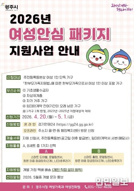 한민일보 서울포커스 곽중희 기자 | 광주시는 여성 1인 가구와 한부모가족의 생활 안전 강화를 위해 ‘여성 안심 종합 지원사업’ 대상자 35가구를 오는 20일부터 5월 1일까지 모집한다고 17일 밝혔다.