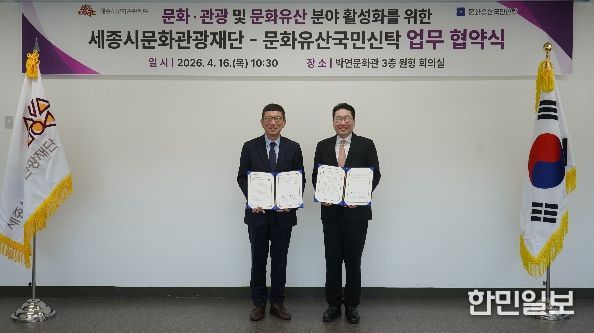 이날 협약식에는 박영국 세종시문화관광재단 대표이사와 이상현 문화유산국민신탁 이사장이 참석해, 양 기관 협력 강화를 통한 문화·관광 및 문화유산 분야 발전과 시민 문화 향유 기회 확대에 뜻을 모았다.