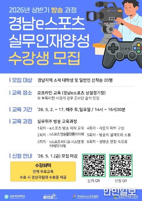 한민일보 서울포커스 박근원 기자 | 경상국립대학교 라이즈(RISE) 사업단은 지역 내 e스포츠 산업 전문가를 육성하기 위해 경남e스포츠협회 및 경남문화예술진흥원과 협력하여 ‘2026년 상반기 경남 e스포츠 실무인재 양성 과정’ 수강생을 모집한다.