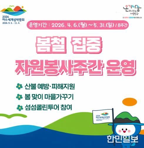 한민일보 서울포커스 임광현 기자 | 여수시는 4월 6일부터 5월 31일까지 8주간 ‘봄철 집중 자원봉사주간’을 운영하고 온기나눔 캠페인을 추진한다고 밝혔다.