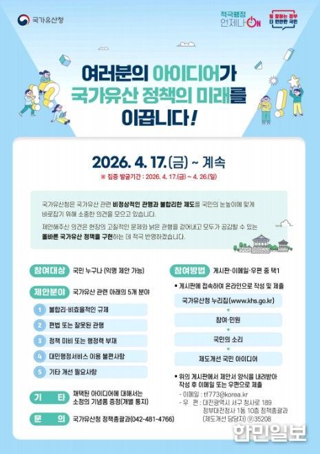 한민일보 서울포커스 박용남 기자 | 국가유산청은 국가유산 관련 비정상적인 관행과 불합리한 제도를 바로잡기 위한 정상화 과제를 발굴하고자 17일부터 국민들의 참신한 아이디어를 받는다.