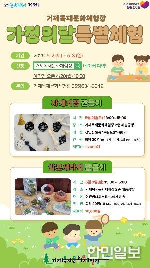 한민일보 서울포커스 김은금 기자 | 거제시 목재문화체험장(동부면 거제중앙로 325, 거제자연휴양림 내 위치)은 가정의 달을 맞아 오는 5월 2일과 5월 3일 이틀간 『자개키링&발포세라믹 만들기 특별체험』을 운영한다고 밝혔다.