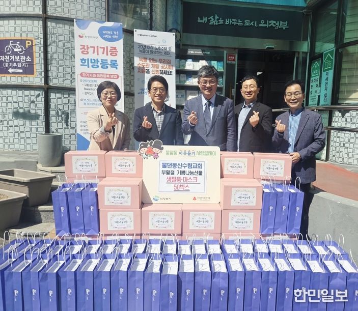 한민일보 서울포커스 심기옥 기자 | 의정부시 장암동주민센터는 4월 16일 물댄동산수림교회가 부활절을 맞아 지역 내 어려운 이웃을 위해 ‘기쁨나눔선물 세트’와 마스크 50상자를 기탁했다고 밝혔다.