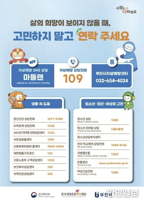 한민일보 서울포커스 김윤이 기자 | 부천시는 부천시자살예방센터와 함께 자살 위험이 높아지는 봄철을 맞아 시민들의 생명 보호를 위한 집중 홍보와 예방 활동에 나선다.