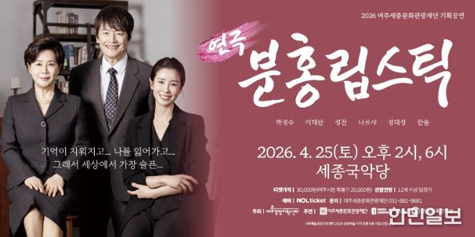 한민일보 서울포커스 전희주 기자 | 여주세종문화관광재단이 오는 4월 25일, 예술경영지원센터의 공모사업인 '공연예술 지역 유통지원 사업'의 일환으로 베테랑 배우들이 참여한 창작 연극‘분홍립스틱’을 세종국악당에서 개최한다.
