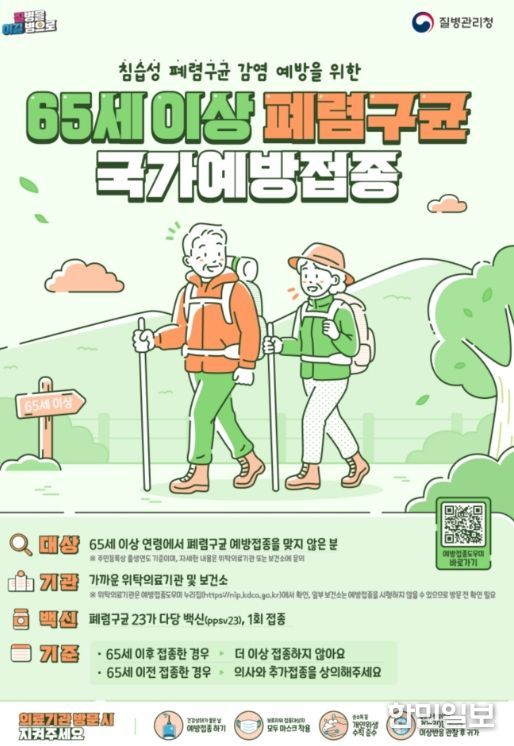 65세 이상 폐렴구균 무료 예방접종은 주소지와 상관없이 가까운 보건소나 위탁 의료기관에서 폐렴구균 23가 다당질백신(PPSV23)을 1회 접종하며, 65세 이후 이미 접종한 경우 추가 접종할 필요는 없다.