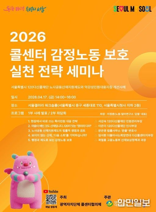 서울특별시 120다산콜재단은 4월 17일 서울갤러리(서울시청 지하1층)에서 광역자치단체 콜센터협의체가 주최하고 서울특별시 120다산콜재단과 노동‧일터연구소 ‘감동’이 공동 주관하는'2026 콜센터 감정노동 보호 실천 전략 세미나'를 개최했다고 밝혔다.