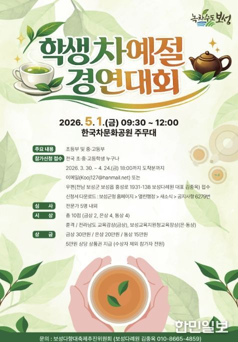 한민일보 서울포커스 박용남 기자 | 보성군은 오는 24일 18시까지 ‘2026 학생차예절경연대회’에 참가할 전국 초·중·고등학생을 모집한다고 밝혔다.