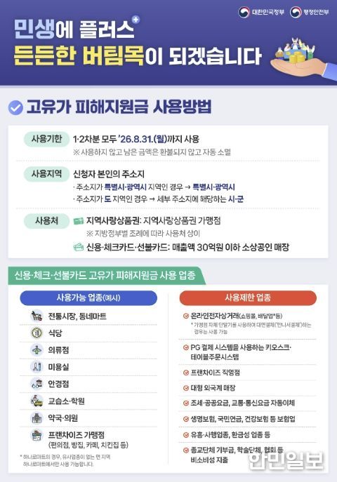 지원금은 지역사랑상품권(공주페이), 신용카드·체크카드, 선불카드 중에서 선택하여 지급받을 수 있으며, 연 매출 30억 원 이하 소상공인 매장에서 사용할 수 있다. 사용 기한은 올 8월 31일 자정까지이며, 그 이후에는 소멸된다.
