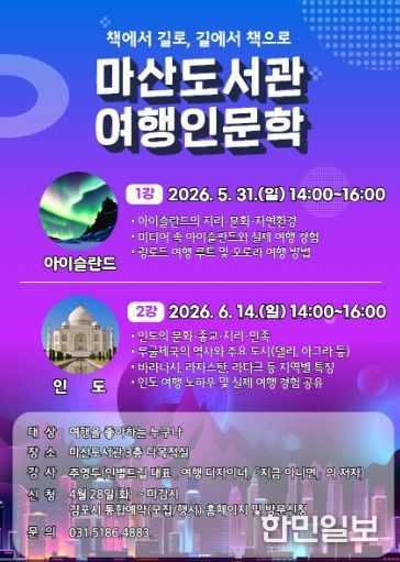 한민일보 서울포커스 임경복 기자 | 김포시 마산도서관이 오는 5월 31일과 6월 14일 오후 2시부터 4시까지 다목적실에서 여행 인문학 강연 ‘책에서 길로, 길에서 책으로’를 운영한다.