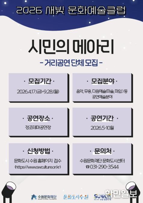 한민일보 서울포커스 진광성 기자 | 수원문화재단은 지역 공연예술의 활성화와 수원시민의 주체적 문화예술 참여를 위해 ‘새빛 문화예술클럽 '시민의 메아리'’ 사업에 참여할 생활예술단체를 모집한다.