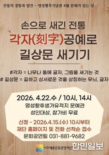 한민일보 서울포커스 전희주 기자 | 여주세종문화관광재단은 오는 4월 22일, 명성황후기념관 4월 문화가 있는 날 프로그램으로 '손으로 새긴 전통, 각자(刻字)공예로 길상문 새기기'를 진행한다.