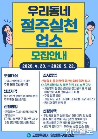 모집 기간은 오는 20일부터 5월 22일까지이며, 고양시 일산동구 소재 일반음식점 중 주류를 판매하는 업소를 대상으로 한다.