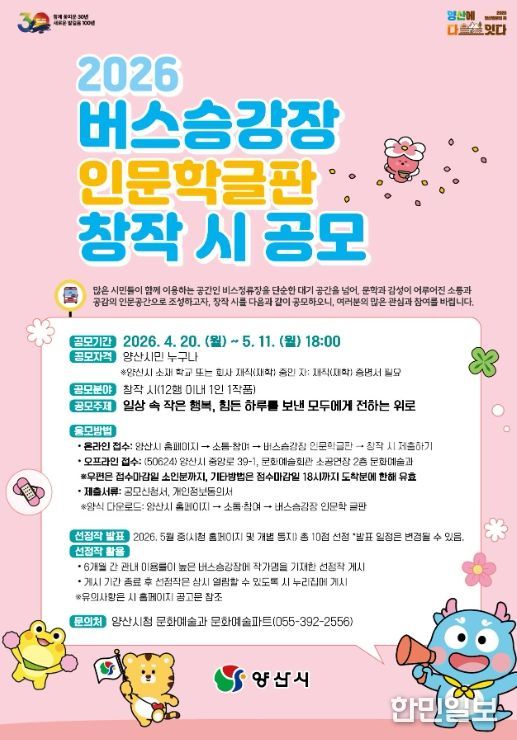 한민일보 서울포커스 김은금 기자 | 양산시는 시민들의 일상 공간인 버스승강장을 문학적 감성이 흐르는 인문 공간으로 조성하기 위해 ‘2026 버스승강장 인문학글판 창작시 공모’를 추진한다.
