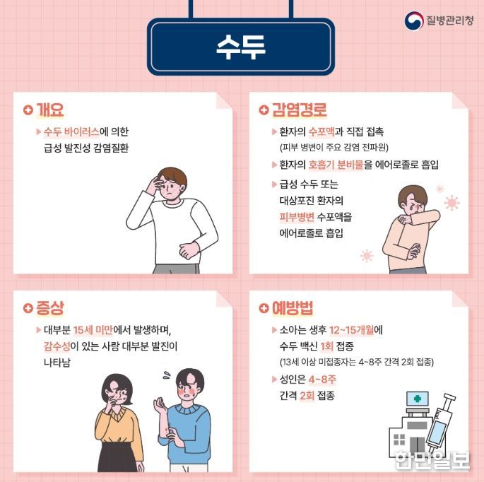 수두는 수두-대상포진 바이러스에 의해 발생하는 감염병으로 발열과 함께 온몸에 수포성 발진이 나타나는 것이 특징이며, 유행성 이하선염(볼거리)은 바이러스 감염으로 침샘이 붓고 통증을 동반하는 질환이다.