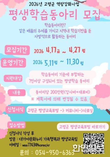 한민일보 서울포커스 임경복 기자 | 고령군은 지역 주민의 학습 열기를 확산하고 지속 가능한 학습 생태계를 조성하기 위해, 오는 4월 17일부터 27일까지 ‘2026년 고령군 역량강화 사업’의 일환인 '평생학습동아리' 10개 팀을 모집한다.