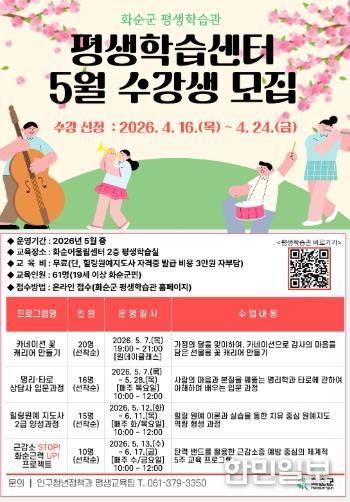 한민일보 서울포커스 박용남 기자 | 화순군은 찾아가는 전남형 평생학습 공모사업과 연계해 군민의 자기계발과 건강한 여가 활동 지원을 위해 ‘5월 평생학습센터 프로그램’ 수강생을 모집한다고 밝혔다.