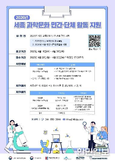 한민일보 서울포커스 기자 | 세종테크노파크가 세종시의 지역 과학문화 저변 확대와 활성화를 위해 이달 20일부터 30일까지 ‘지역과학문화 주체발굴 및 활동 지원' 공모를 실시한다.