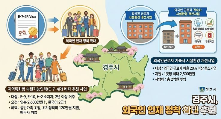 한민일보 서울포커스 김봉순 기자 | 경주시는 외국인 인재 정착을 확대하기 위해 ‘지역특화형 숙련기능인력(E-7-4R) 비자 추천 사업’과 ‘외국인 근로자 기숙사 시설환경 개선사업’을 추진한다고 19일 밝혔다.